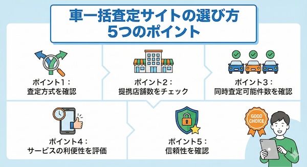 数ある車一括査定サイトの中から、自分に最適なサービスを選ぶために、以下の5点をチェックしましょう。